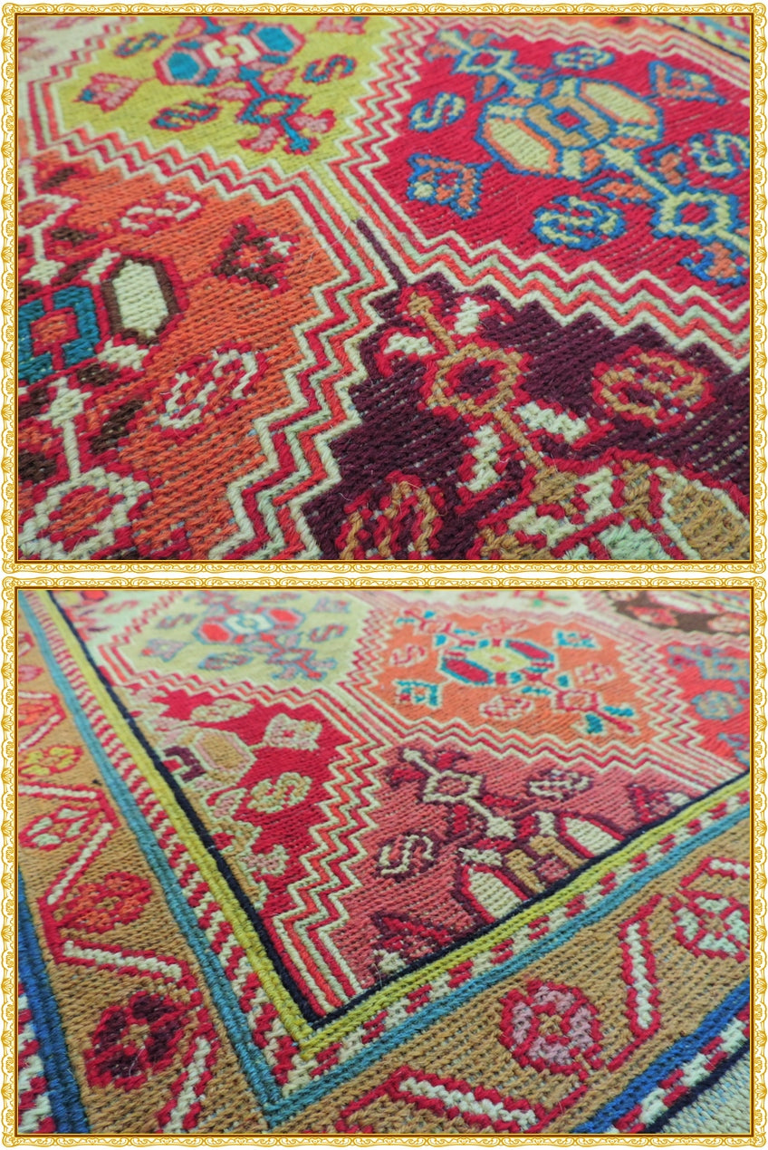 大小様々な大きさがありますので、用途は色々。スマックキリム織り方は、緯糸を使って模様を描くシンプルなキリムとは異なり、スマックでは緯糸は目に見えず、糸をつなぐ役割を果たします。スマックは、キリムの裏側の模様を作った後に残った余分な横糸と糸をそのまま残した単列織りです。この織りの美しさは、その列数の高さにあります。このタイプのキリムの織り方は経糸巻き織りで、糸を糸の周りに巻き付けて織ります。細い緯糸を通し、織り櫛で叩くことで、経糸と緯糸が絡み合います。スマックはヴァルニとともに、シルジャン地方で最も一般的なキリム織りの一種であり、ケルマーン州、東アーゼルバイジャン州、アルダビール州、ホラーサーン州、チャハルマハル・バフティヤーリー州、でも織られています。