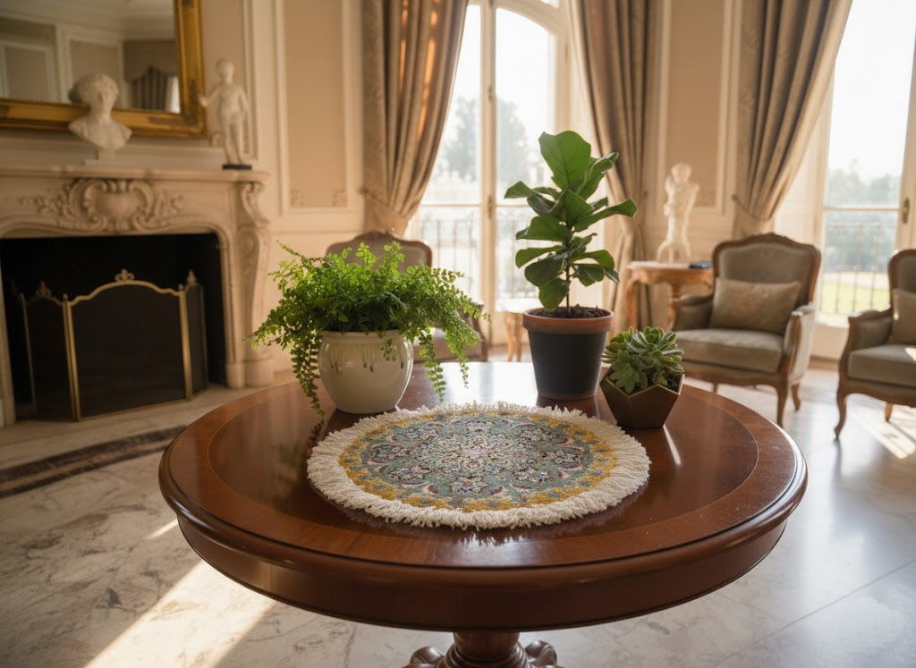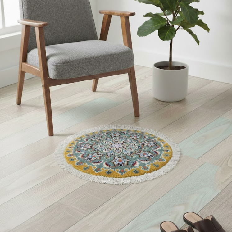 人気のラウンド(円形)タイプですので、敷く場所を選びません。 玄関マットとしてはもちろん、お気に入りのチェアやサイドテーブルの足元、ベッドサイド、リビングのアクセントラグ、または観葉植物を飾るスペースなど、和洋問わずどんなインテリアにもスッと馴染み、空間を華やかに演出してくれます。