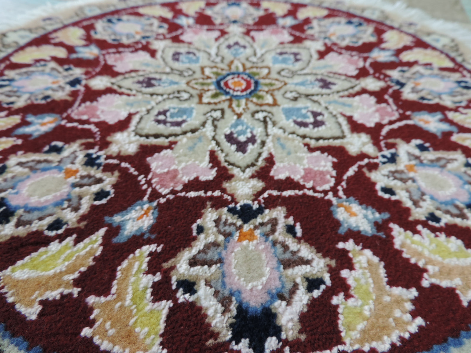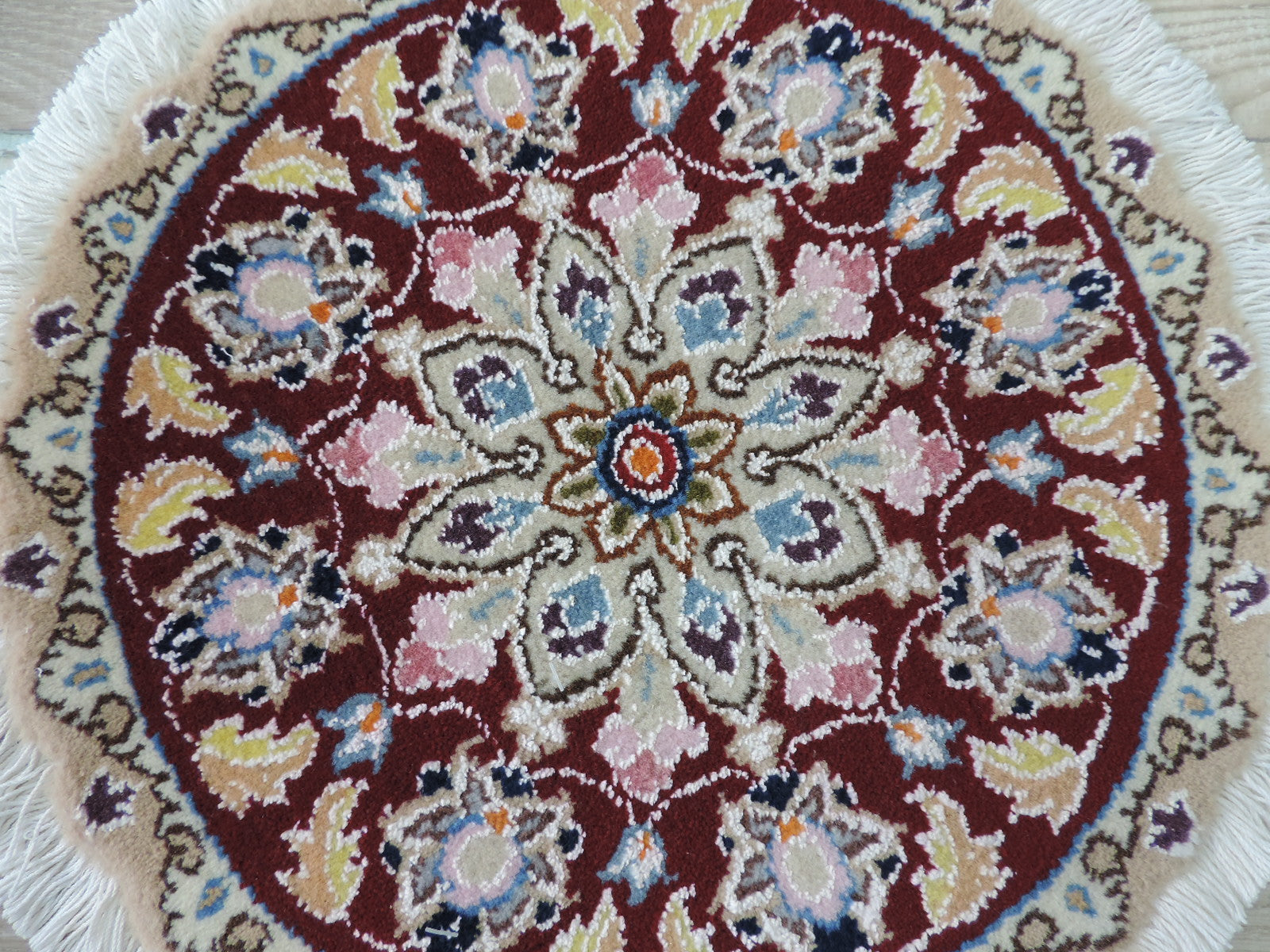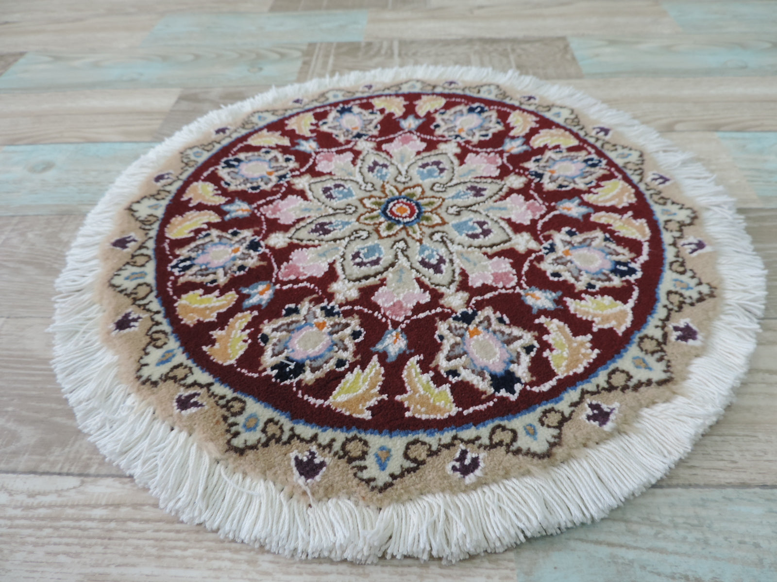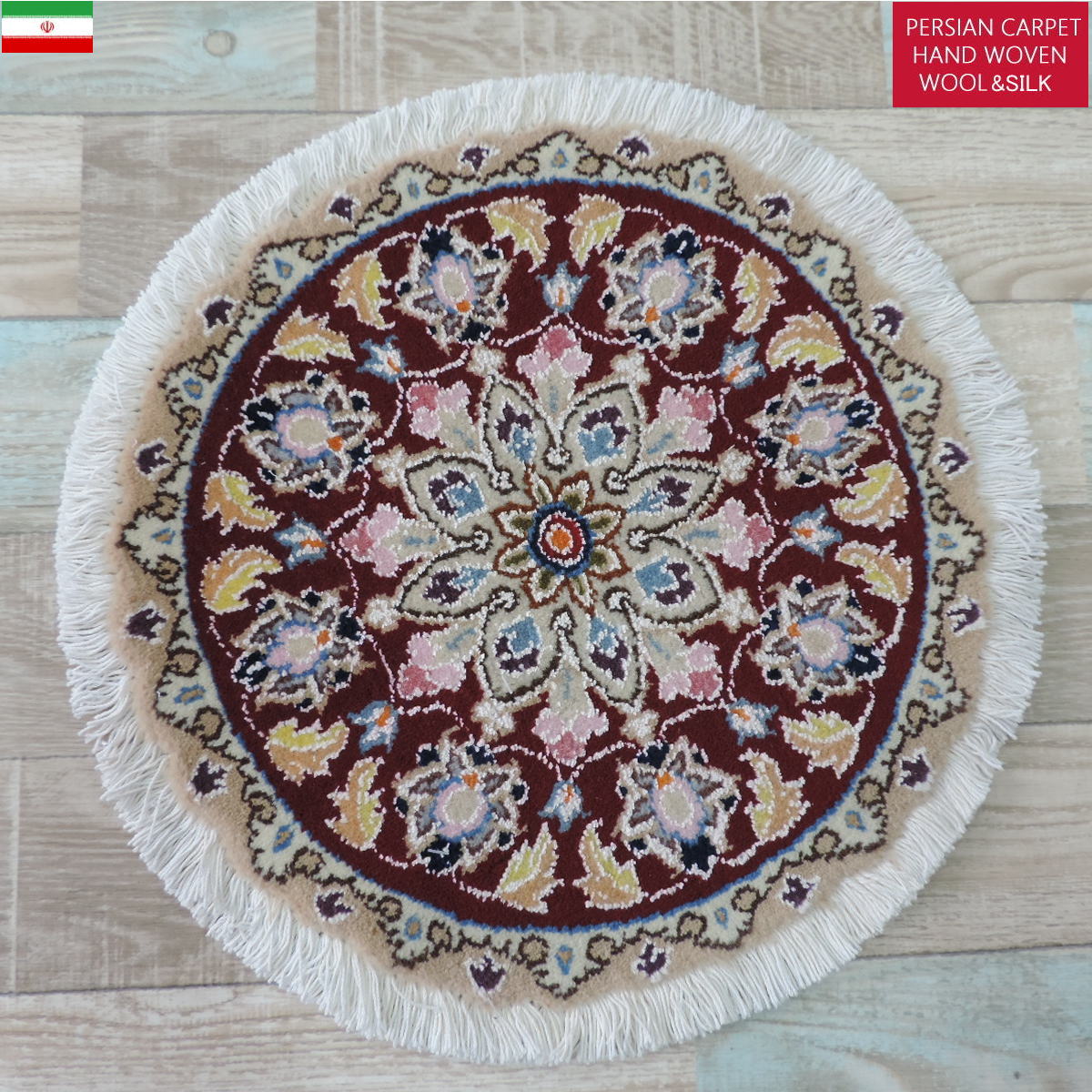 ペルシャ絨毯 愛らしいミニ丸形 ウール100% 手織り ペルシャ絨毯の本場 イラン ナイン産チェアーマット玄関マットなどに、サイズ 40cm×40cm【本物保証/直輸入】