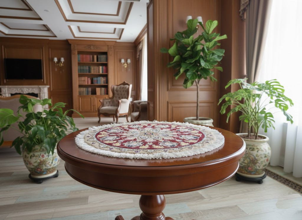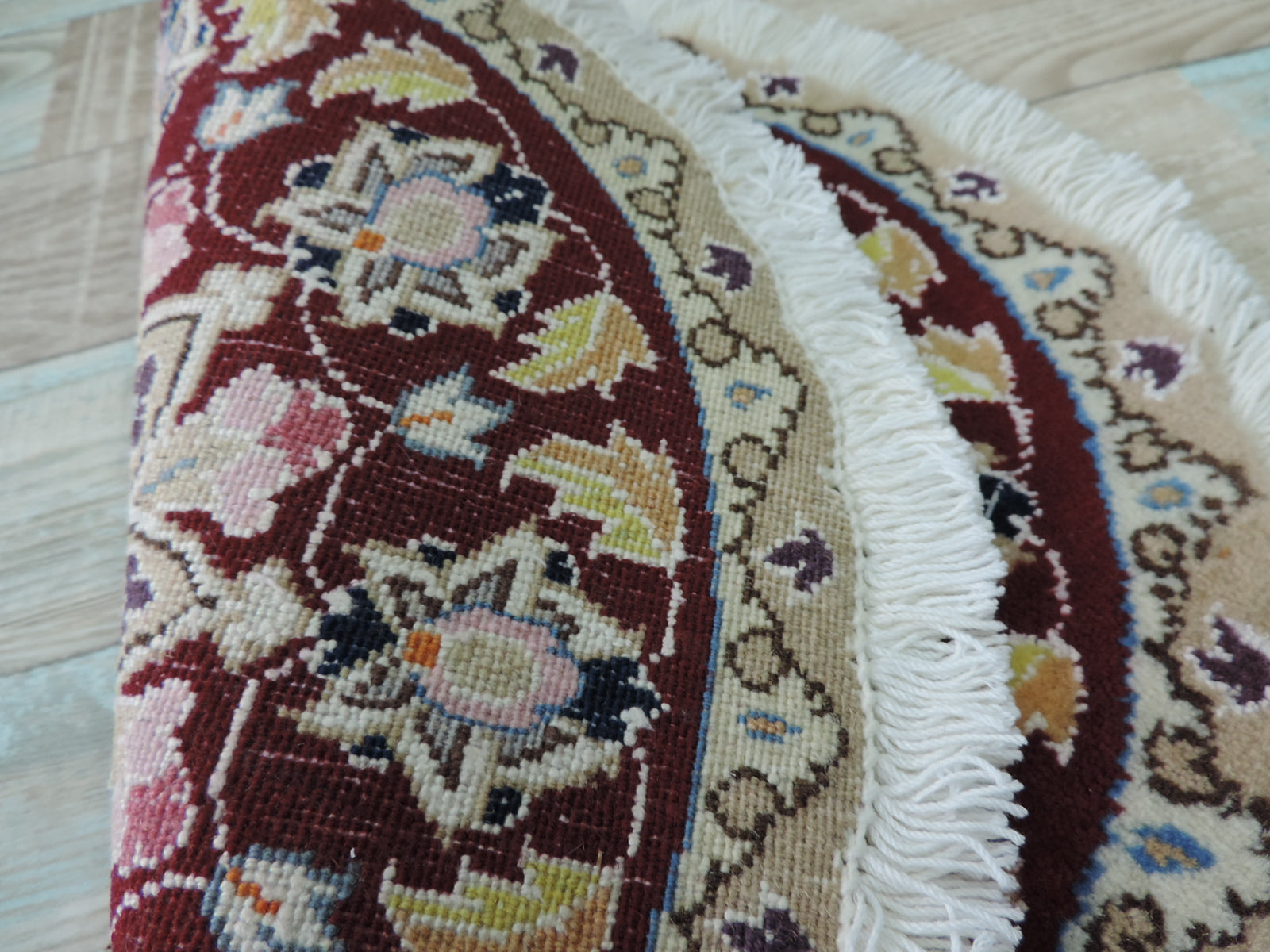 通常、ペルシャ絨毯は長方形や正方形が一般的ですが、こちらは希少な丸形。熟練の職人が曲線の一本一本まで丁寧に織り上げており、周囲にあしらわれたボリュームのあるフリンジ(房)が、より一層華やかさを引き立てています。